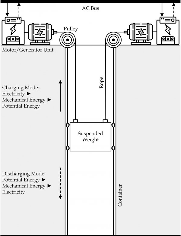 该系统包括电动发电机组、起重绳、传动装置和钢或混凝土块。它的功能与城市建筑中的传统电梯相似,运行速度几乎相同。